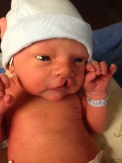 Evan was born on Wednesday, October 16, 2013 at 1:54 pm. He came out big and healthy and screaming like a hornet. I saw him and was instantly in love with him. He weighed 7 lbs., 2 oz. and measured 19.5 inches long. Jonathan immediately turned into the dentist that he is and began to scope out the extent of the cleft. We could immediately see his lip, but after quick inspection we discovered that his palate was complete. There was no cleft. Also, usually when there is a cleft lip, the gum line is also involved with a cleft but Evan's was complete. His lip, while cleft, was NOT complete like we suspected. It does not extend up into his nostril, but stops a few millimeters below his nose. We were told that if his palate was involved there was no way I could nurse him. If it was just his lip, it would be questionable because many times suction is not possible. Jonathan called Judy (our lovely nurse practitioner) and filled her in on what we knew and she told us to go ahead and try nursing. I had nursed the other three, so she told me to treat Evan just like I would my other babies. We will see how things go.